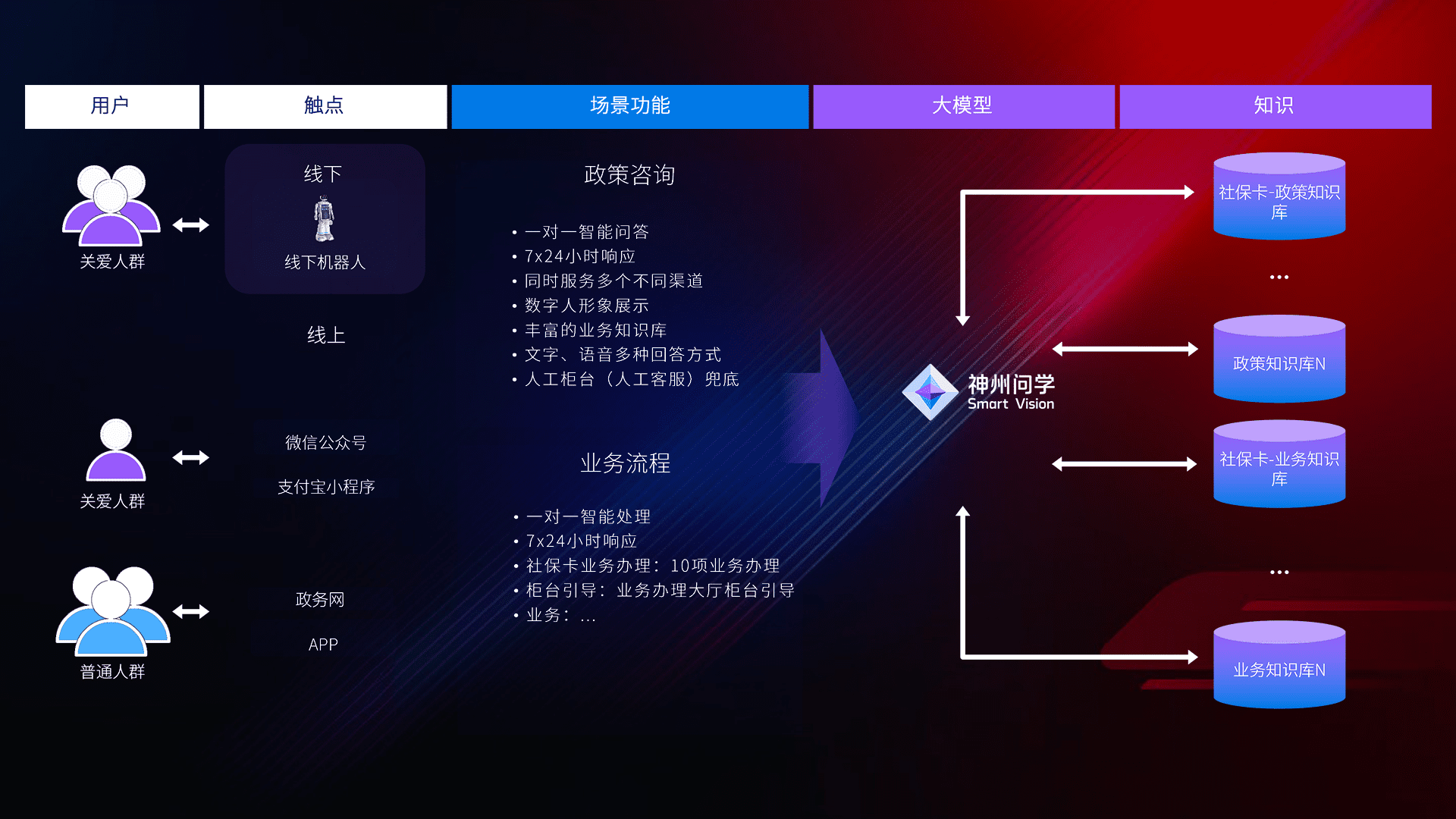• 线上线下全覆盖:线上提供微信公众号、、、、支付宝小程序、、、、政务网、、、、app多种渠道,,,与线下机器人形成完整服务体系。。。。