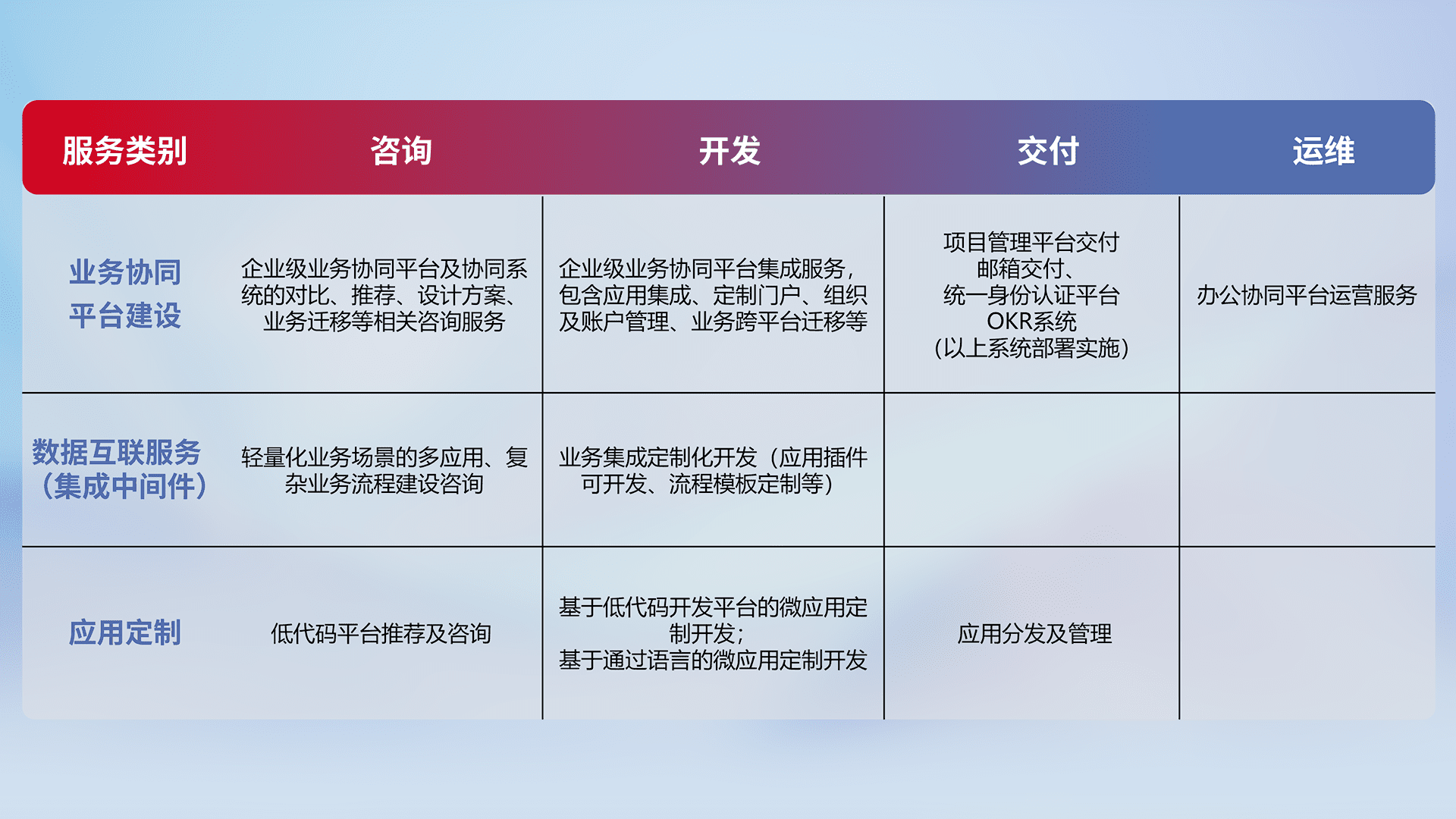 针对钉钉、、、企微、、、IDaas等平台级产品提供产品的规划、、、、方案、、、、交付、、、定制化开发等服务,,,实现如统一协同办公、、智能客户服务、、、混合会议管理、、、、智能数据查询、、、等业务场景,,,实现数字化转型。。